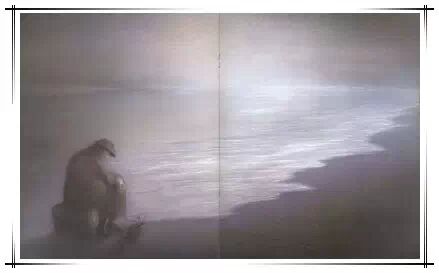 同样是表现大海,请看这两幅常见儿童读物的插图。绘画作者不是同一个人,上色的也不是同一个工作室,也不是由同一个出版社出版的,出版时间也不相同,但是我们看到这两幅画却非常的相似,大海都是蓝的,太阳是红的,树是绿的,都是单调的固有色。其中一幅的中心位置是太阳,另一幅没有太阳,就在同一位置安排了一艘船,仍然是红色的,就好像事先商量好了一样,真是“英雄所见略同”。这两幅画,画出来的东西虽然多,但是带给我们的信息却几乎为零,在这两幅画里作者没有任何话要说,作者的注意力全在尽快完成这件产品,拿到稿酬上。但是《奥菲莉亚的影子剧院》的画面虽然非常简单,但是信息是非常丰富的。我们说过,