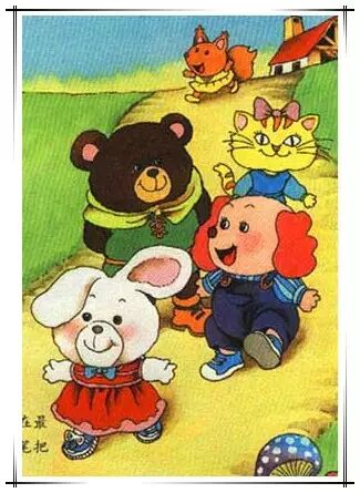 图上的文字是这个意思:许多小动物放了学一起回家。但我们从这张图上感觉到,这些熊、猫、兔子,它们长得都很相似,就像是一群小孩在一起开化妆舞会一样。