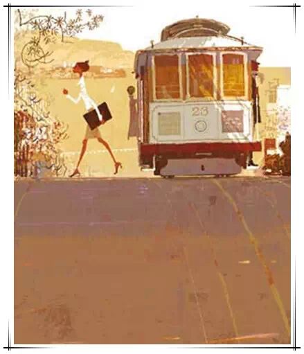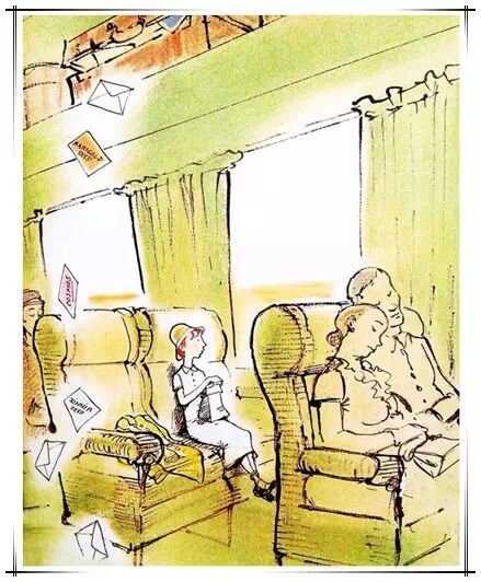 再看《园丁》的这幅插图,描绘的是小女孩坐在一辆奔驰的列车上,小女孩的线条纤细轻盈,显得娇小柔弱,而她身下座位的线条却浓黑粗重,显得又笨又沉,但给人感觉坐起来非常的安全。