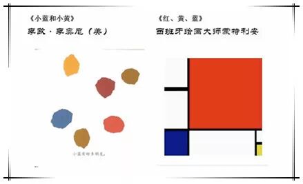 我们再来看看抽象主义的作品。分别是图画书《小蓝和小黄》、以及抽象派的创始人之一蒙特利安的代表作《红、黄、蓝》系列中的一幅。它们的共同点就是完全没有具体的形象,以纯粹的线、色、快,作为艺术的“语言”;
