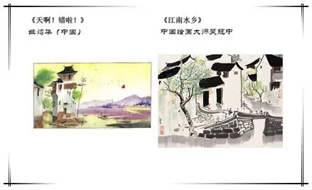 最后我们来看看中国民族风格的绘画。分别是我和徐萃的图画书《天啊!错啦!(No! That’s Wrong!)》的一个画面,和著名画家吴冠中先生的作品《怀乡》,两者表现的都是中国水墨画的韵味,有很浓郁的中国风格。