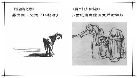 第一组对比图都是传统写实主义的素描作品,分别是图画书《流浪狗之歌》中的画面、十七世纪“巴洛克”时代荷兰艺术大师伦勃朗的作品《两个妇人和小孩》,它们都是运用简单但灵活多变的线条来进行创作;