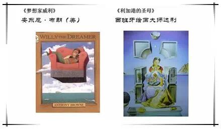下面一组是超现实主义画风。超现实主义描绘的是现实中不存在的,或比现实夸张的场景及人物。比如图画书《梦想家威利》和超现实主义的代表人物达利的作品《利加港的圣母》,我们甚至可以将《梦想家威利》这一封面理解为作者安东尼·布朗向达利致敬的一幅作品,这就好像许多电影导演运用许多相同的桥段和手法来表达他们对李小龙的敬意一样;